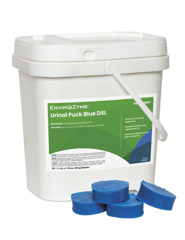 Urinal Puck Blue DSL is comprised of bacterial cultures capable of degrading uric acid which is the leading cause of scaling and odors in urinals.